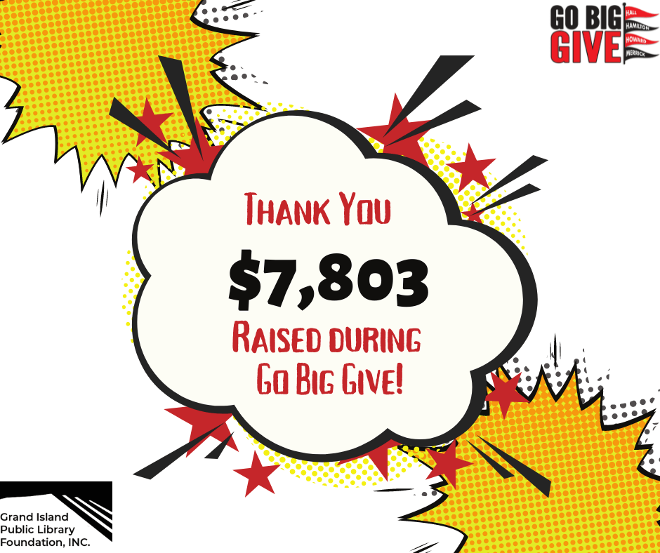 On behalf of the Library and Foundation, we give sincere thanks to the Go Big GIVE Organization and Sponsors, Donors, Friends of the Library, The Chocolate Bar, Paper Tiger Shredding, Volunteers, Board Members and Library Staff for helping us raise $7,800 during Go Big Give! We are so very thankful for your support and dedication to City of Grand Island – Public Library and the many patrons they serve! Thank you for investing in free access to life-long learning.
