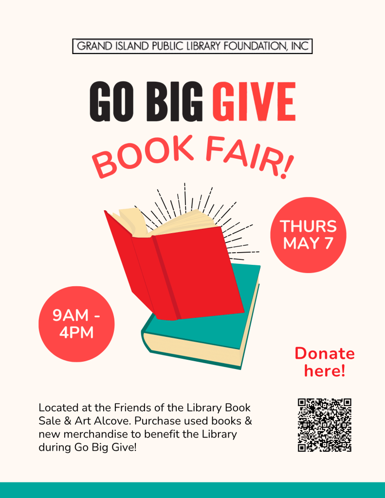 Join us on May 7 for the Friends of the Library Book Fair at Grand Island Public Library. The event will run from 9:00 a.m. to 4:00 p.m. Volunteers will have books for purchase, as well as specialty bookmarks made and donated by local artists. Proceeds from the sale will be donated to GoBigGive to benefit the Grand Island Public Library.