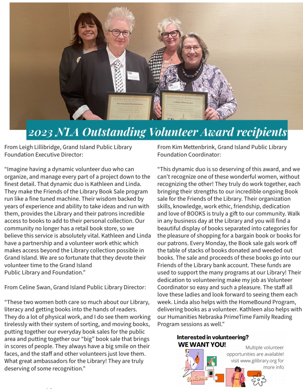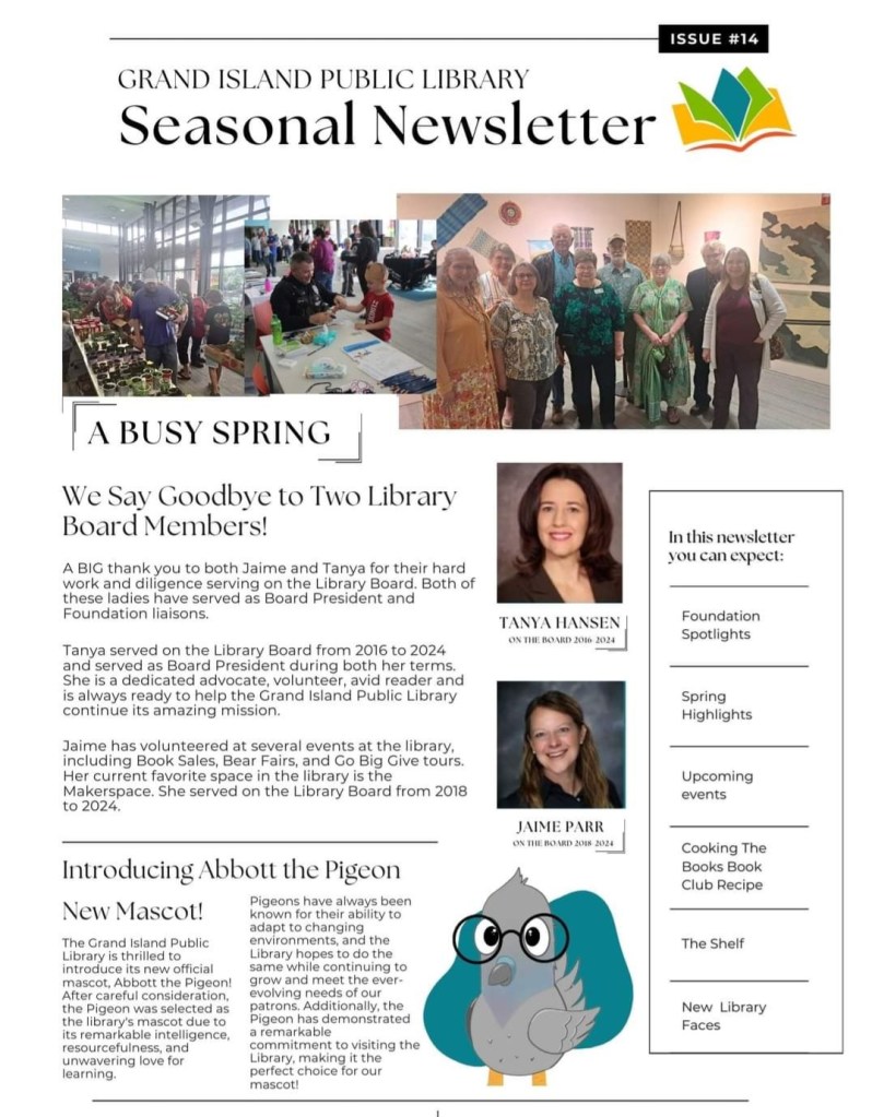 The Foundation appreciates Tanya Hansen and Jaime Parr for their years of dedicated service to the Library and the Foundation. They have both completed their terms of office, so we wish them the very best in their future endeavors. We will miss them beyond measure and hope to see them around the library!